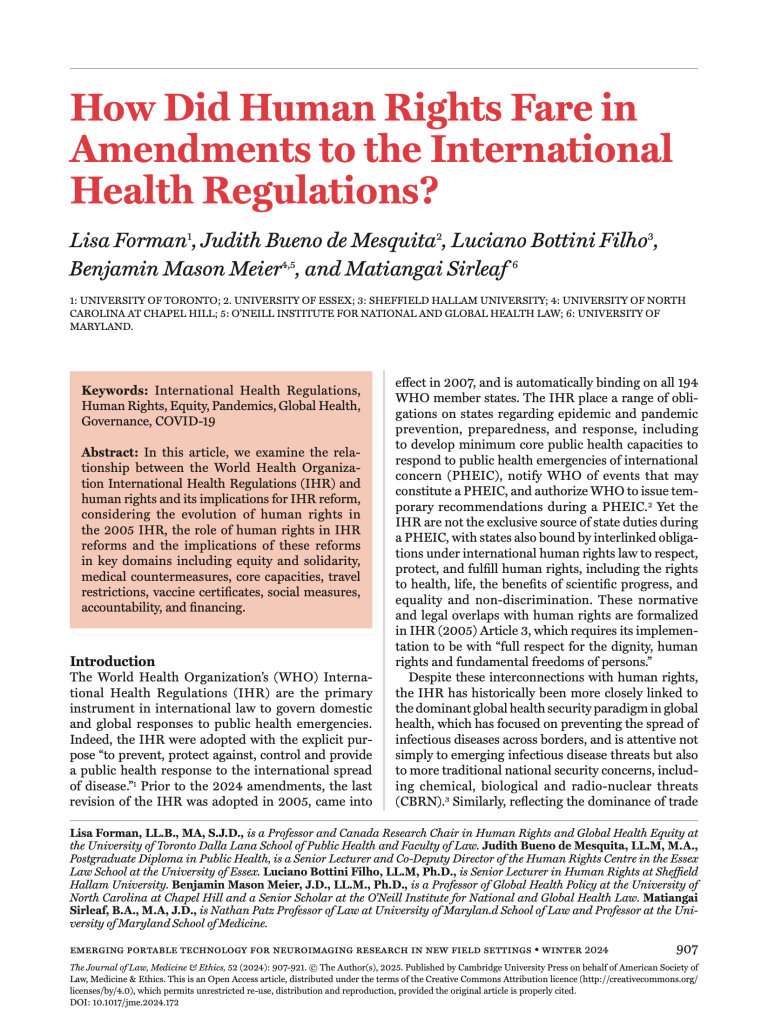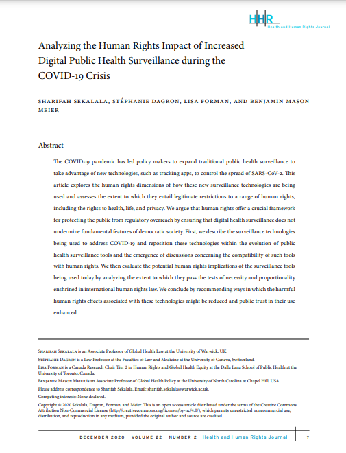 - Benjamin Mason Meier, University of North Carolina at Chapel Hill, USA